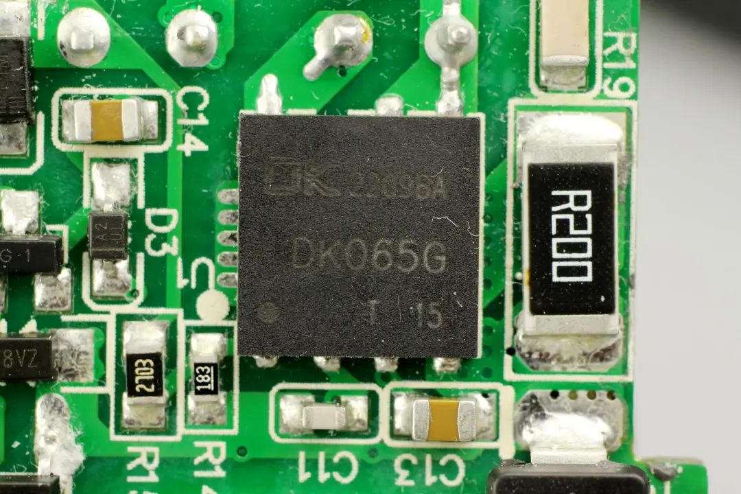 充電器初級(jí)主控芯片采用了一顆來(lái)自東科的合封氮化鎵芯片DK065G,是一顆內(nèi)部集成了650V氮化鎵開(kāi)關(guān)管的準(zhǔn)諧振反激開(kāi)關(guān)電源功率芯片。DK065G采用谷底開(kāi)通以降低開(kāi)關(guān)損耗,最高支持250kHz開(kāi)關(guān)頻率,待機(jī)功耗低于50mW,采用DFN8*8封裝,適用于PD快充,電源適配器等應(yīng)用。