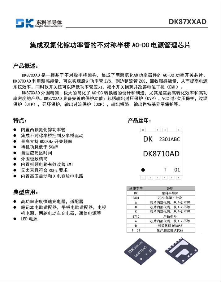 東科半導(dǎo)體推出基于不對(duì)稱(chēng)半橋架構(gòu)的全合封氮化鎵AC-DC電源管理芯片DK8715AD系列