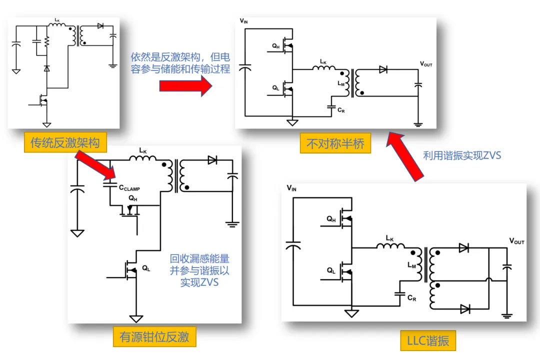 不對(duì)稱(chēng)半橋AHB拓?fù)浼夹g(shù)集成了LLC和反激的優(yōu)點(diǎn),實(shí)現(xiàn)了初級(jí)側(cè)零電壓開(kāi)關(guān)(ZVS)和次級(jí)側(cè)零電流開(kāi)關(guān)(ZCS),提高了系統(tǒng)的效率。通過(guò)采用電感與電容雙儲(chǔ)能元件,可以有效減小變壓器體積,從而提高系統(tǒng)的整體緊湊性。